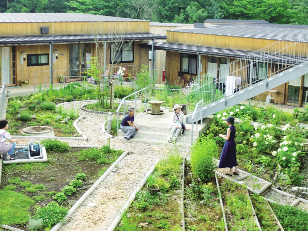 中庭では入居者同士が語らう