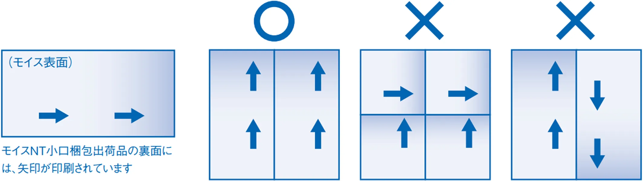 ①モイスNTには、方向性があります。方向を統一しないで施工すると意匠的に不具合が起きます。 モイスNT裏面に印刷された矢印の向きを考慮して施工してください。